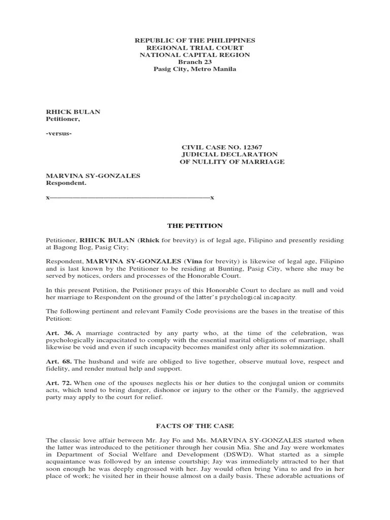 Petition For Annulment Sample PDF Intimate Relationships Marriage