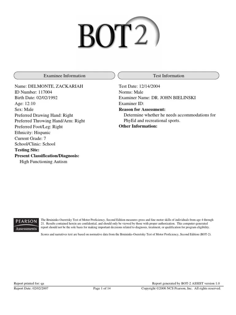 BOT2 Complete Form Sample Report Balance (Ability) Motor Coordination