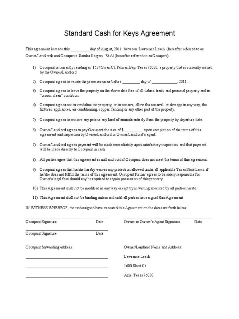 Cash For Keys Agreement Form Fill Online, Printable, Fillable, Blank