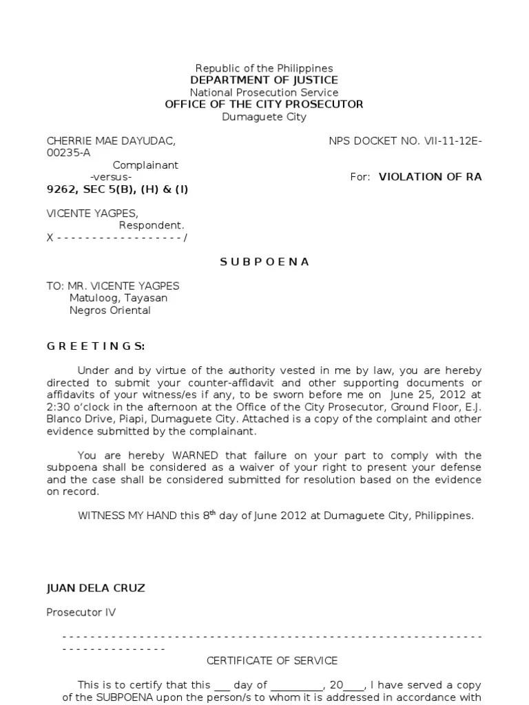 Sample Subpoena for Respondent Service Of Process Prosecutor