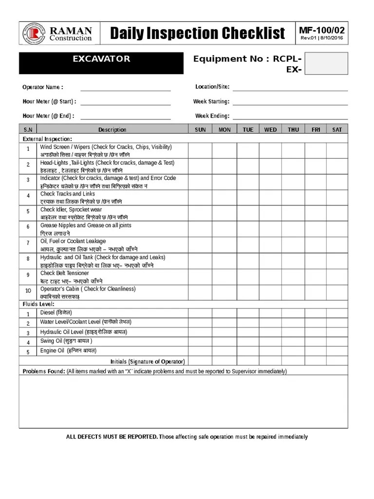 Web key components of a daily equipment inspection checklist: Web an equipment maintenance log is an important document that holds the record of maintenance and. Daily vehicle inspection checklist in a easy to use portable book. Web free heavy equipment inspection checklist pdf.
