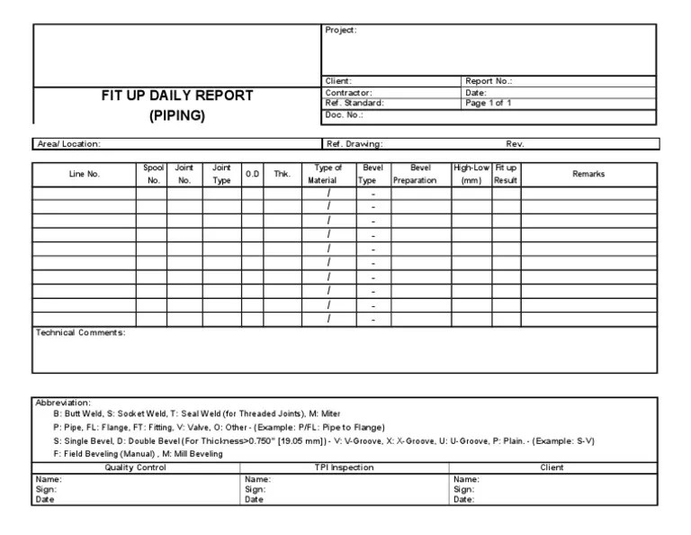 Piping Daily Fit Up Quality Control and Inspection Report Form Pipe