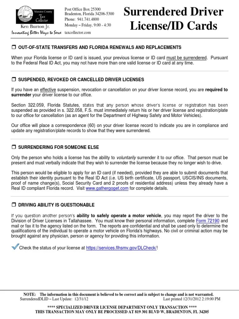 Surrendered Driver License/ID Cards OutOfState Transfers and Florida