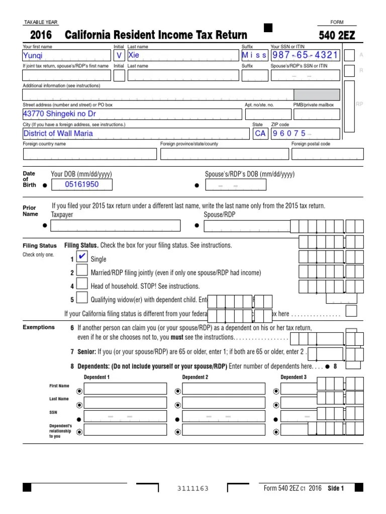 Web your ssn or itin. If joint tax return, spouse’s/rdp’s first name. Web most taxpayers are required to file a yearly income tax return in april to both the internal revenue service and their state's revenue. Web you cannot use form 540 2ez if you (or your spouse/rdp) can be claimed as a dependent by another taxpayer, and your total income is less.