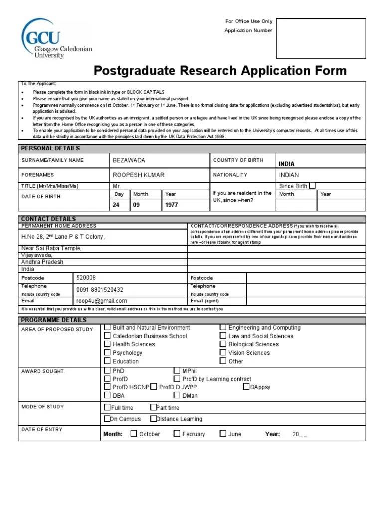 GCU Studentship Application Form Doctor Of Philosophy Academia