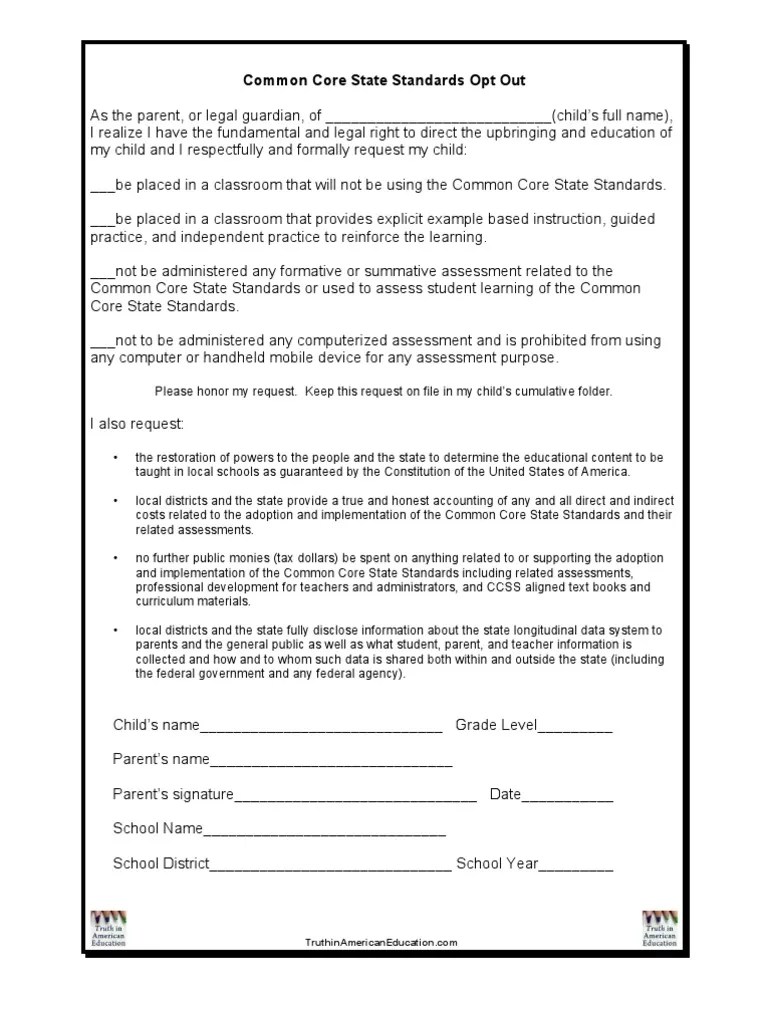 CCSS Parent OptOut Form Common Core State Standards Initiative