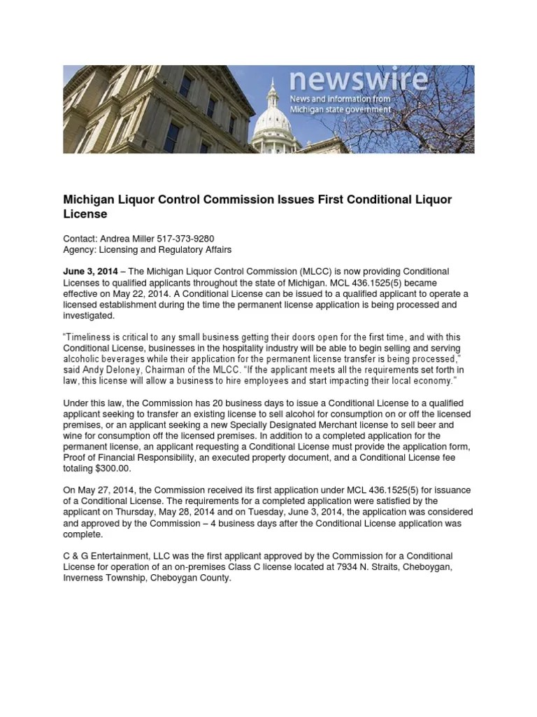 Michigan Liquor Control Commission Issues First Conditional Liquor