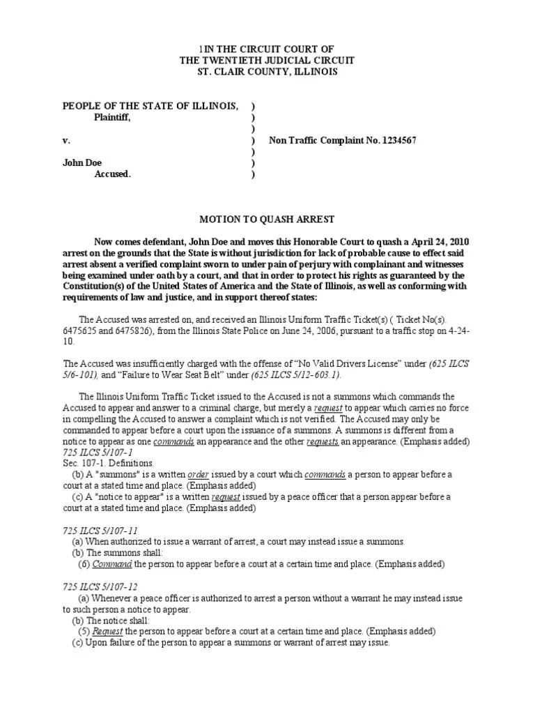 Illinois Motion to Quash Arrest Traffic Indictment Search And Seizure