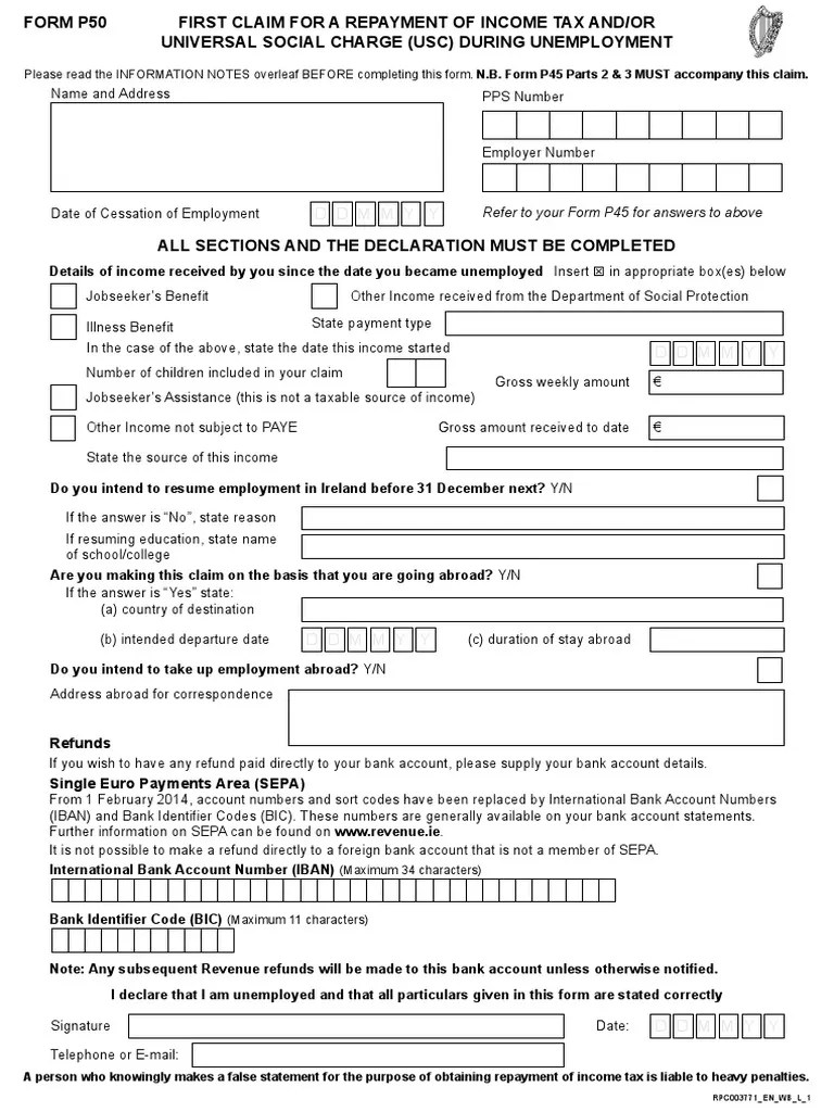 The p50 form is used to claim a tax refund if you won’t be working for at least four weeks and you’re not claiming. Web form p50 first claim for a repayment of income tax and / or universal social charge (usc). Web form p50 is used when you have stopped working and you wish to claim back overpaid tax.