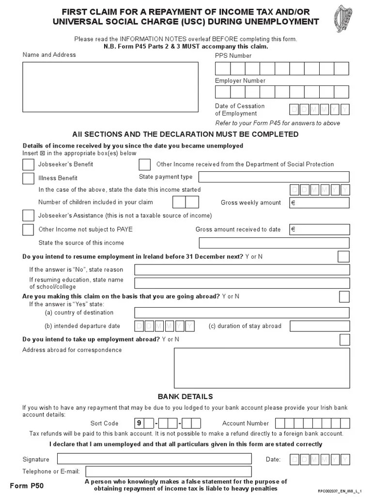 Fill Free fillable FORM P50 FIRST CLAIM FOR A REPAYMENT OF (Irish