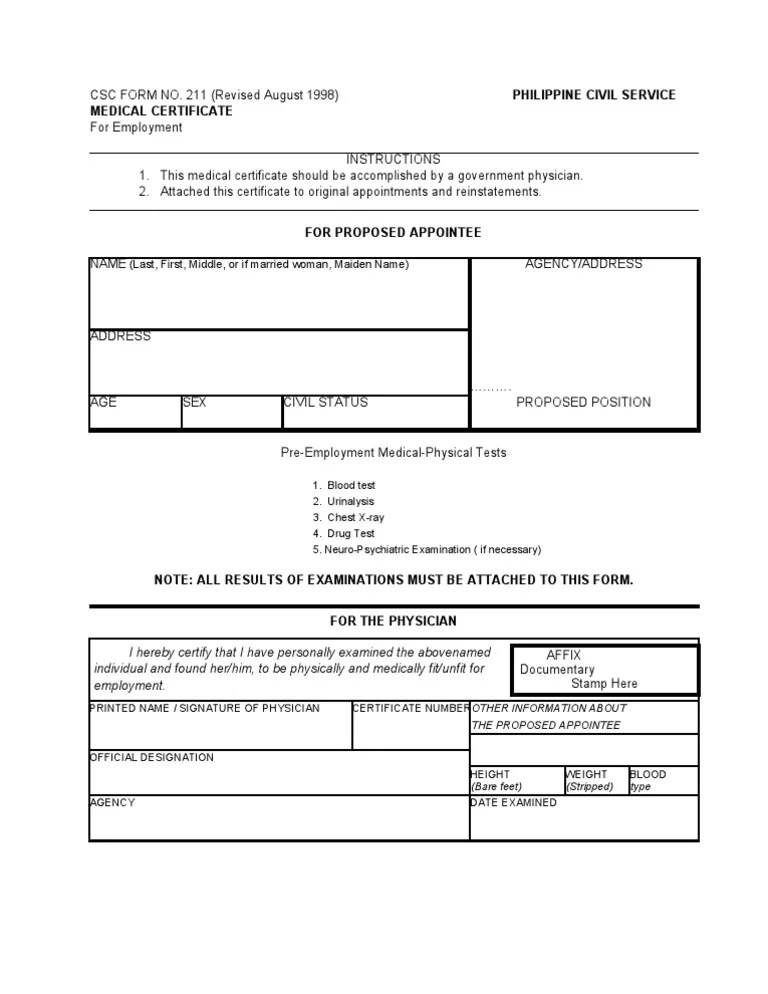 Medical Certificate CS Form No 211 Rev2018