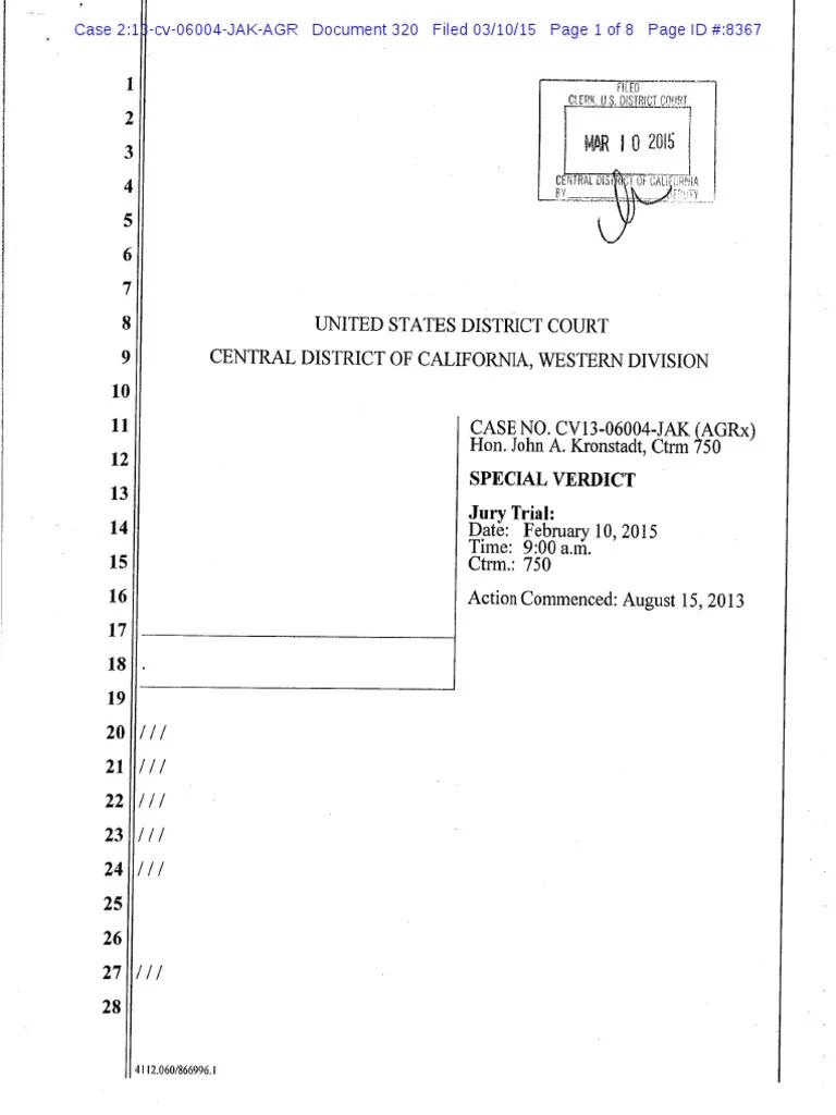 Pharrell Williams + Robin Thicke v. Gaye jury special verdict filled