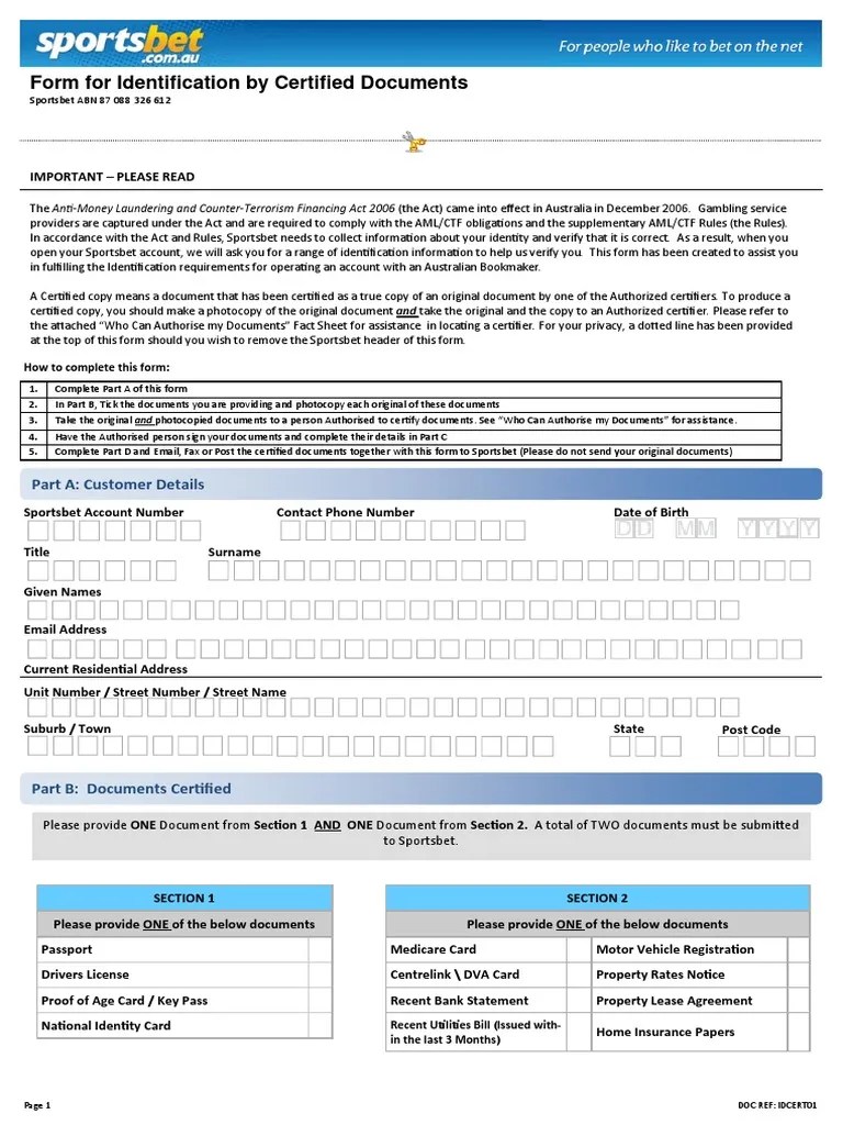 Sportsbet ID by Certified Document Form Identity Document Fax