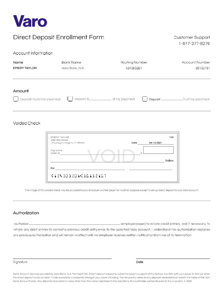 Varo Bank Direct Deposit Form - Managing your finances by tracking your spending and knowing when. To deposit a check in the varo app, tap move money >. How you receive your tax refund will depend on what information you give the irs. Can i get higher limits for varo advance? You may open a varo bank account by using the varo mobile application (the mobile app). Web they can come at different dates/times each pay period. Typically, that means you get paid up to 2 days early ¹ instead of waiting. Are you still looking for a fast and practical solution to fill in varo bank account. Web how do i set up direct deposit? Direct deposit of paychecks, benefits, or other payments.