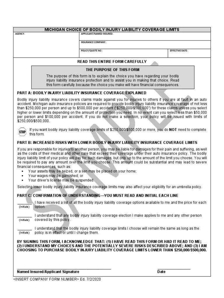 Michigan Bodily Injury Liability form Liability Insurance Vehicle