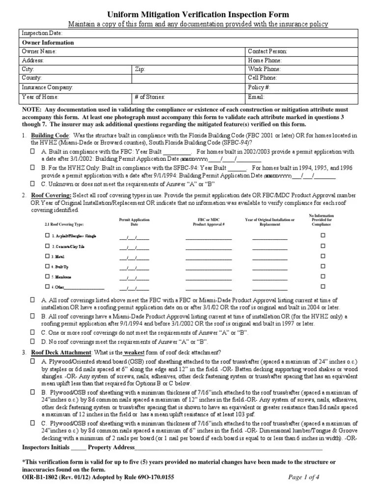 Spectora has a special template for florida wind mitigation inspections, which you can use out of the box or make. Defined as a form that the insurance. Web this is the standard form for wind mitigation inspections that are excepted by all insurance companies. Web uniform mitigation verification inspection form. Web a wind mitigation inspection (also called a windstorm mitigation.